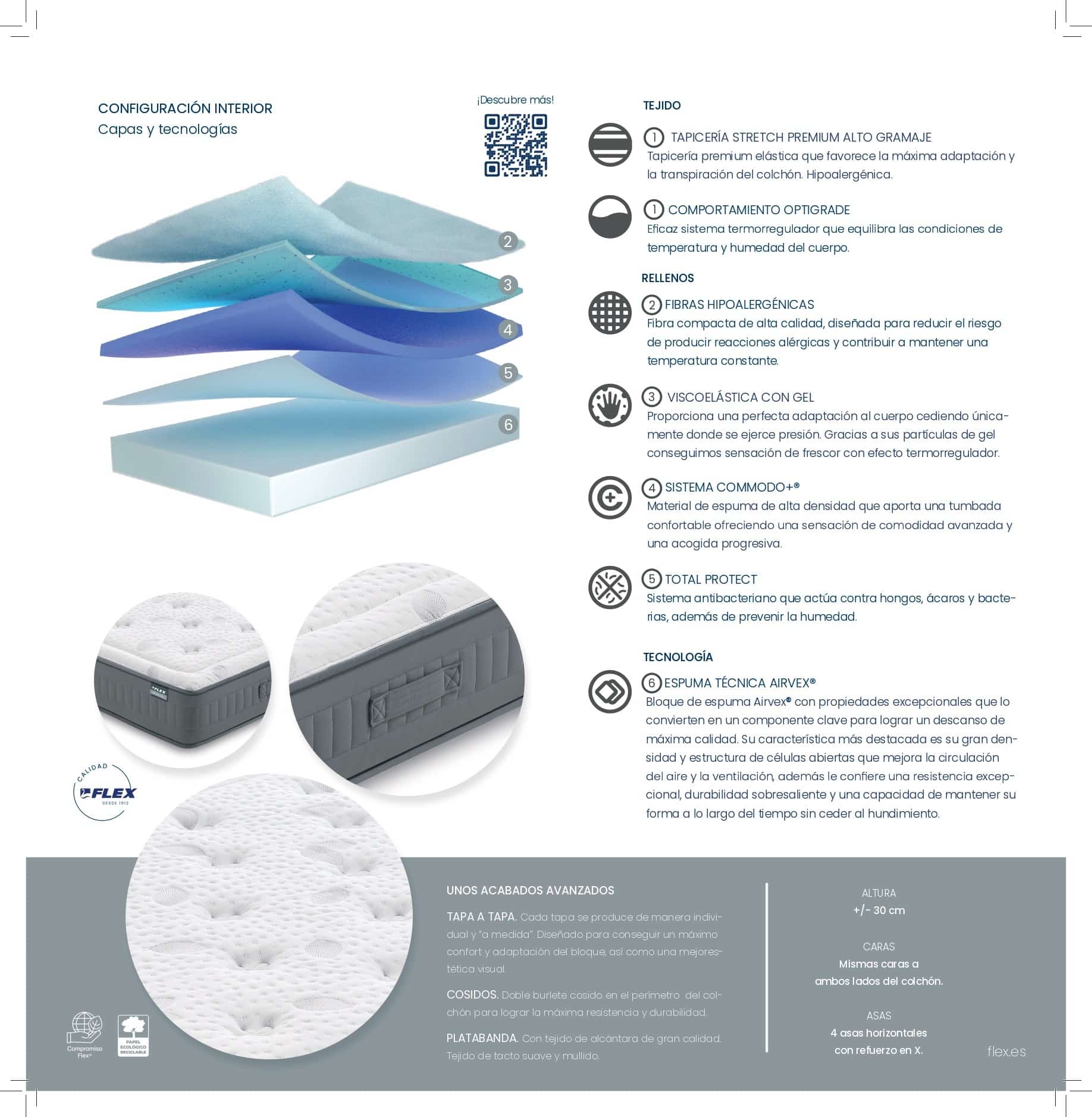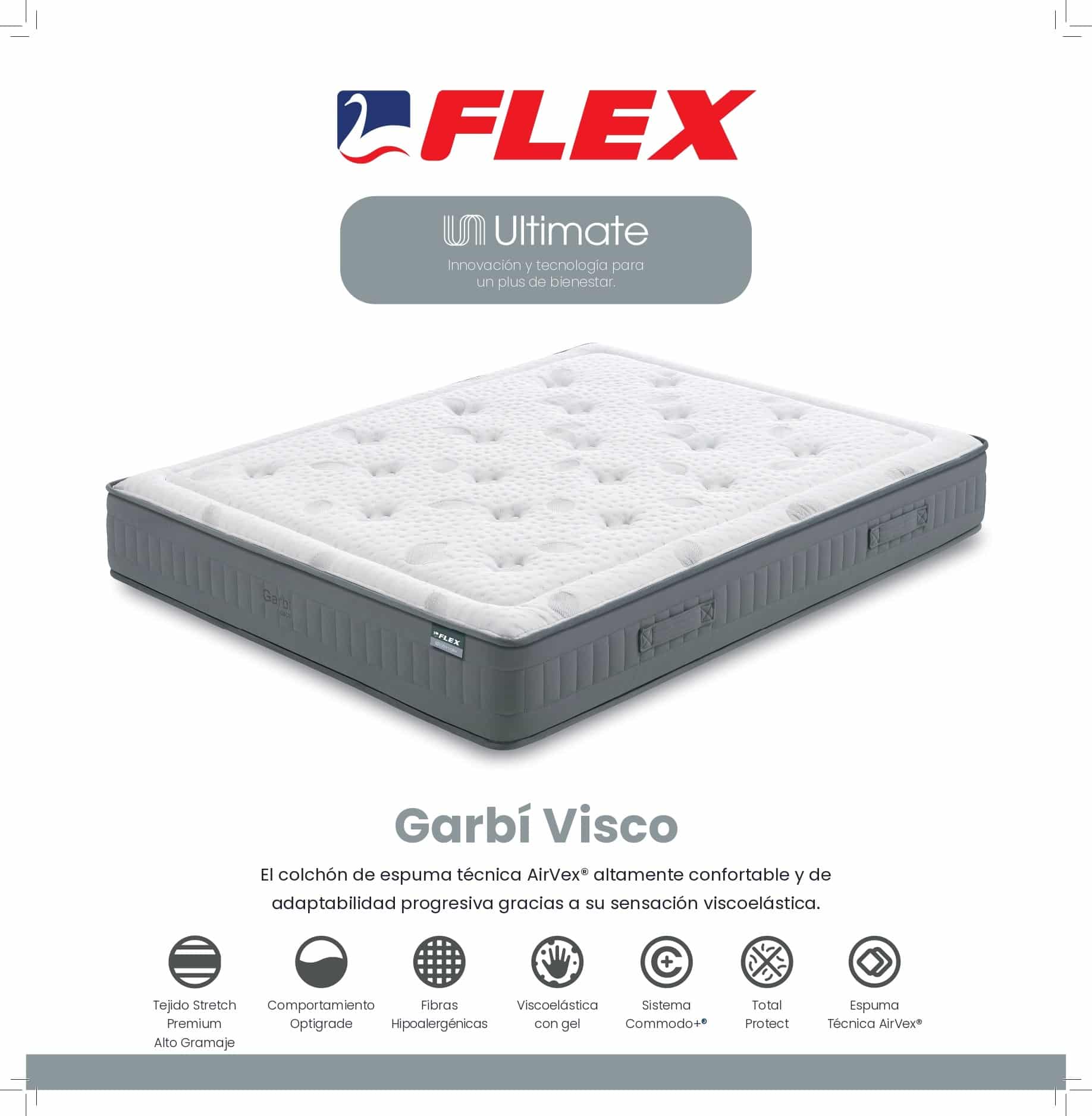 - Firmeza. Gracias a su espuma técnica Airvex®, el colchón Garbi de Flex es ideal para aquellas personas que buscan un nivel medio-alto de firmeza. Consiste en un bloque de espuma de gran densidad con tecnología Airvex y de célula abierta que ofrece un perfecto comportamiento en cuanto a resistencia, durabilidad, hundimiento y estabilidad a lo largo del tiempo.