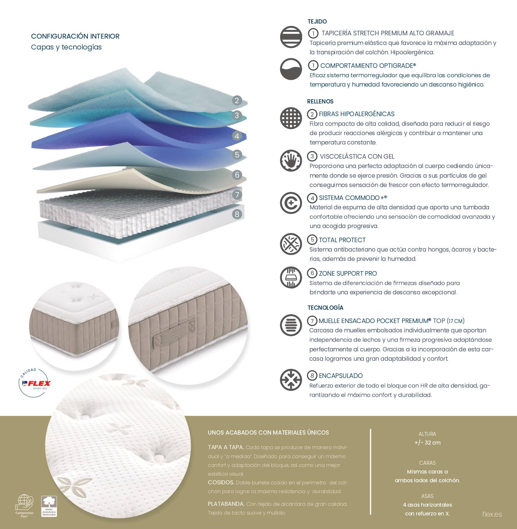 Firmeza: El Nantes de Flex incorpora una tecnología innovadora que consiste en un sistema de diferenciación de firmezas, el cual ha sido diseñado para brindarte una experiencia de descanso excepcional. El Zone Support Pro se caracteriza por ofrecer una acogida única y un refuerzo específico en la zona lumbar, una característica que te permitirá disfrutar de un descanso personalizado y altamente confortable.